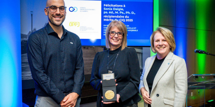 Félicitations à Sonia Daigle, professeure titulaire et lauréate du Mérite du CIQ. Ce prix reconnaît son engagement soutenu au sein de l’Ordre des psychoéducateurs et psychoéducatrices du Québec et sa contribution à la reconnaissance de la psychoéducation.