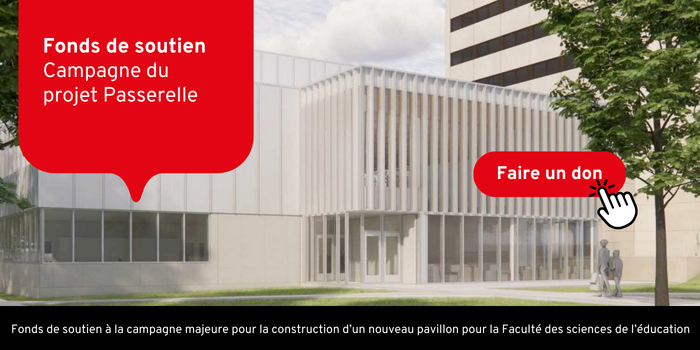 Direction de la philanthropie et des relations avec les diplômées et diplômés de l'Université Laval Pavillon Alphonse-Desjardins, 2325, rue de l’Université, local 3402, Université Laval, Québec (Québec) G1V 0A6